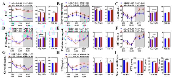 Heat stress alters the body temperature, biochemical indexes, and sperm motility in rams. (A–H) The diurnal rhythms based on a Jonckheere–Terpstra–Kendall (JTK) analysis of THI, body temperature, and biochemical indexes (n = 6 per time point). ADJ.P for adjusted minimal p-values, ADJ.P < 0.05, indicates a significant effect on circadian rhythm, AMP represents amplitude, and ZT represents Zeitgeber time. White bars in the graph represent daytime, and gray bars represent nighttime. (I) Sperm motility parameters (n = 6). Asterisks indicate significance at p < 0.05 (*), p < 0.01 (**), p < 0.001 (***).