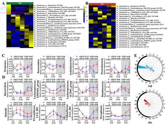 Heat stress alters the circadian rhythm of rumen microbes in rams. (A,B) Heat map showing oscillating ASVs in the NH (left) or HS (right) groups. (C,D) The diurnal rhythm of rumen microbes at phylum and genus levels (n = 6 per time point), respectively. (E) The polar plots represent the time when the ASV’s peak level of abundance occurred; blue (NH group) or red (HS group) shading represents the number of rhythmic ASVs with an estimated peak value for each time, as determined with JTK analysis. The radius of black concentric circles indicates the number of rhythmic ASVs, and the minimum radius of the black concentric circle represents one ASV. The black arc on the left side of the polar plot indicates the day/night cycle.