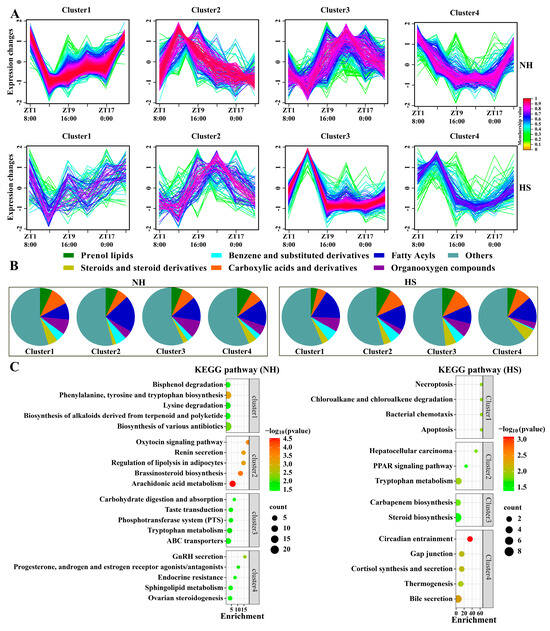 Heat stress alters the diurnal pattern of rumen metabolites in rams. (A) Identification of distinct temporal patterns of metabolites in the NH and HS groups using fuzzy c-means clustering. The y-axis represents normalized data based on all metabolites within each cluster. (B) Classification of metabolites. (C) KEGG analysis (p < 0.05) of the metabolites within each cluster in the NH and HS groups.