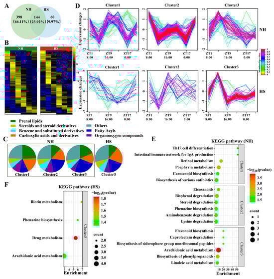 Heat stress alters the circadian rhythm of rumen metabolites in rams. (A) Venn diagram showing the number of rhythmic metabolites and also significant differences between groups. (B) Heat map showing oscillating metabolites in the NH (left) or HS (right) groups. (C) Classification of metabolites. (D) Identification of distinct temporal patterns of metabolites in the NH and HS groups by fuzzy c-means clustering. (E,F) Pathways annotated for rumen metabolites based on the KEGG database (p < 0.05).