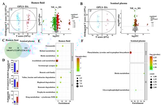 Heat stress alters the composition of metabolites in rumen fluid and seminal plasma. (A,B) Heat stress altered rumen and seminal plasma metabolomic profiles based on orthogonal partial least-squares discriminant analysis (OPLS-DA) in the NH and HS groups, respectively. Differentially abundant rumen and seminal plasma metabolites were visualized using volcano plots in the NH and HS groups, respectively. (C) Venn diagram showing the number of metabolites between rumen and seminal plasma. (D) Common differential metabolite in rumen fluid and seminal plasma. (E,F) Pathways annotated for rumen fluid and seminal plasma metabolites based on the KEGG database (p < 0.05). Asterisks indicate significance at p < 0.05 (*), p < 0.01 (**).