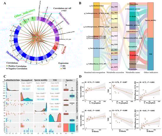 To further analyze the relationship between the changes in rumen microorganisms, metabolites, and sperm motility induced by HS, we analyzed the potential correlations between microbes, metabolites, sperm motility, and other parameters. The results showed that six metabolites (4-coumaryl alcohol, D-biotin, dopamine quinone, homocysteine sulfinic acid, kaempferol, and L-tryptophan) were positively correlated with sperm motility and negatively correlated with the THI (p < 0.05; Figure 6A). Three metabolites (ethenoadenosine, netilmicin, and piromelatine) were negatively associated with sperm motility and positively associated with the THI (p < 0.05; Figure 6A). Our results further revealed that all of these metabolites were related to rumen microbes, and we mapped a Sankey diagram to describe these complex interactions (Figure 6B). Among these metabolites, kaempferol was negatively correlated with Lachnobacterium and positively correlated with Lachnospiraceae_XPB1014_group, Saccharofermentans, and Veillonellaceae_UCG_001 (p < 0.05; Figure 6B,C). In addition, both L-tryptophan and D-biotin were reduced in the seminal plasma of the HS group (p < 0.05). Correlation analysis showed that these metabolites were positively correlated with Veillonellaceae_UCG_001 and sperm motility, but negatively correlated with the THI (p < 0.05; Figure 6D).