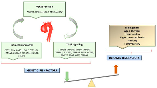 Along with genetic factors, other risk factors for TAA include hypertension, smoking, hypercholesterolemia, male sex, advanced age (over 65 years), and the presence of a bicuspid aortic valve (Figure 1) [9,12,13].