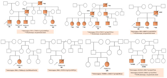 In the first four patients with MS, coming from the same family, we found variable expressivity correlated with the FBN1 c.7343G>A, p.(Cys2448Tyr) variant detected by molecular testing (Illumina TruSight Cardio Sequencing Panel).
