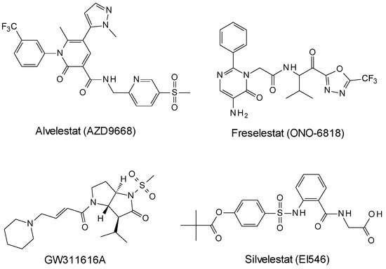 The most popular and potent elastase inhibitors contain a peptide chemical scaffold mimicking the endogenous substrate, as observed for human protein elafin, that is physiologically produced in several tissues and exerts a protective effect from destruction by the up-regulated immune responses [18]. Additionally, several peptide- and nonpeptide-based inhibitors act as irreversible inhibitors, establishing covalent interactions with crucial residues located in the catalytic cleft. These compounds have been especially developed to fight pathological processes related to the over-activity of HNE.