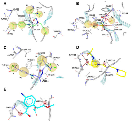 Figure 3A–E describe the five distinct models obtained by LigandScout (version 3.12) [39], which is a platform to build three-dimensional pharmacophore models starting from protein/ligand complexes available in the archive PDB database. For each PDB entry, LigandScout generated a ligand-based hypothesis that was defined by a set of chemical features that were consistent with the aminoacidic residues surrounding each ligand bound to PPE.