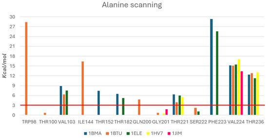 The computational alanine scanning calculated the values of the binding free energy of the protein–ligand complex for selected amino acids before and after applying mutations to alanine. Consequently, the difference in binding free energy allowed us to obtain a quantitative measure of the free energy contribution of the specific residue to the binding free energy of the protein–ligand complex [40]. By analyzing the results, it might be possible to confirm how some mutations caused a weakening in protein–ligand interactions, as evidenced by the positive value of predicted Stability Change (ΔΔGstability.). The obtained ΔΔGstability values generated a ranking of the contribution to the binding, distinguishing the most significant hot spots (ΔΔGstability > 3 Kcal/mol) from the less relevant residues. This computational study was performed by using the Alanine scanning module in Schrödinger (Schrödinger Release 2023-2: Glide, Schrödinger, LLC, New York, NY, USA, 2021) [41], enabling the calculation of the energy contribute of a given amino acid to the total binding free energy for each protein–ligand complex. The analysis was conducted excluding the residue Ala104; moreover, we excluded residues His60 and Ser203 considering that these residues exerted an unambiguous role in catalytic activity of serine protease. The outcomes of this study were collected in Figure 4; for each PDB structure, one or more selected key residues were studied on the basis of previous data collected by pharmacophore hypothesis generation (see Section 2.1).