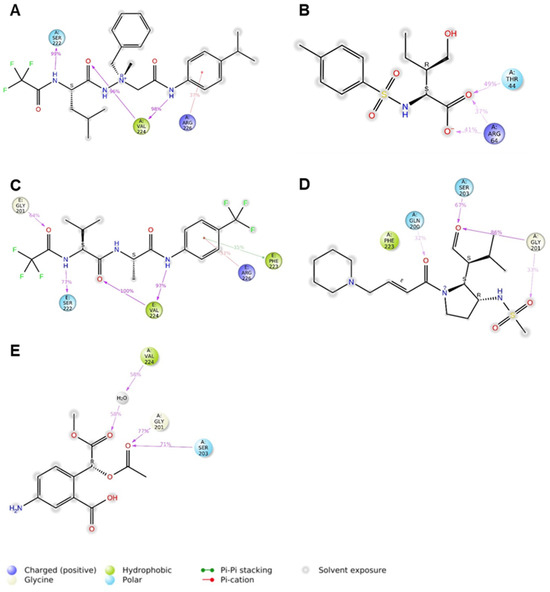 Considering that the high number of obtained features could be too strict to carry out a preliminary virtual screening, in this step of our computational study, we decided to further refine the model with the employment of additional calculations. We chose to perform molecular dynamic (MD) simulations to obtain more data on the crucial contacts, thus improving the chance to identify new promising compounds. The five PDB structures of elastase/ligands 1 BMA, 1 BTU, 1 ELE, 1 HV7 and 1 JIM(E), which were previously applied to create pharmacophore models (see Section 2.1), were now used to perform molecular dynamic studies by using Desmond tool in the Schrödinger software suite (Schrodinger 2023-2) [44,45]. By generating a root mean square deviation (RMSD) diagram for all MD simulations (see Table S1 in the Supplementary Materials), we verified the stability of protein–ligand complexes during the simulation. Figure 6 shows the results of the MD studies that revealed interactions occurring more than 30% of the simulation time. Therefore, we chose to consider relevant the following residues: Thr44, Arg64, Gln200, Gly201, Ser 203, Val221, Ser 222, Phe223, Val224 and Arg226. Cross-referencing these data with the outcomes of computational alanine scanning (see Section 2.3), we can assume that for the studied crystal complexes, the most relevant contacts might be summarized as follows: (i) polar interactions with Val 224 and Gln200; (ii) stable hydrophobic interactions with Phe223.