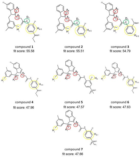Based on the optimized 3D pharmacophore model displayed in Figure 7, we subsequently screened our in-house library of compounds named CHIME23, that consists of a large collection of small molecules bearing distinct heterocyclic scaffolds. Among them, the most populated chemical classes were quinolines, isoquinolines, imidazoles, triazoles, benzimidazoles, thiazoles, thiadiazoles, and 2,3-benzodiazepines. These compounds were synthesized in the medicinal chemistry laboratory by Laura De Luca, Rosaria Gitto, and their coworkers at the University of Messina during the last few decades. In more detail, CHIME23 collects small molecules that have been proved to be active ligands targeting various pathological pathways in human pathologies (antivirals, neuroprotective, anticonvulsants, and anticancers). Despite the large chemical space of compounds from the CHIME23 collection, the virtual screening query furnished hits belonging to the only class of N-substituted-1H-benzimidazol-2-yl]thio]acetamides that we have previously developed as anti-HIV-1 non-nucleoside reverse transcriptase inhibitors [46]. In particular, seven compounds 1–7 proved to possess the best pharmacophore fit scores and matched the identified chemical features, as detailed in Figure 8.