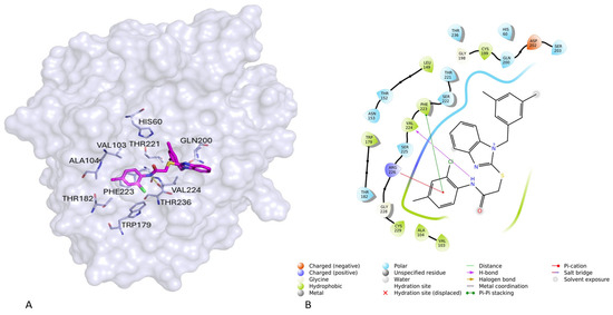 In this case, amino acids were rendered flexible within 6 Å of the centroid of coordinates x: −12.2628, y: 20.1692, z: 37.7359 obtained from the 5 co-crystallized ligands used for the generation of the pharmacophore model (1 BMA, 1 BTU, 1 ELE, 1 HV7, 1 JIM). The residues made flexible include the following: His60, Val103, Gln200, Ser203, Ser222, Phe223 and Val224. All ligands were subjected to 100 runs and a 10 Å box was evaluated. The “Allow early termination” option was unchecked and the CHEMPLP function was used. All ligands were previously prepared using the LigPrep tool implemented in Maestro, generating the possible ionization states at pH 7.0 ± 2.0 using Epik (Schrödinger Release 2024-3: Epik, Schrödinger, LLC, New York, NY, USA, 2024) [59]. The (best) pose was examined for the study of interactions with the target using Maestro (Schrödinger Release 2024-3: Maestro, Schrödinger, LLC, New York, NY, USA, 2024).