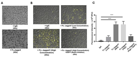 To demonstrate the effectiveness of Jag-1 functionalized beads in activating Notch signaling in vitro, we utilized a reporter cell line, consisting of CHO cells engineered to express YFP upon activation of Notch, as previously reported by Elowitz et al. []. In this reporter cell line, YFP expression is driven by the cleavage of the Notch receptor, which includes an attached, truncated variant of the transcriptional activator Gal4, which in turn drives YFP expression under the control of a UAS promoter. This approach allows for easy visual feedback to verify Notch activation without needing to probe gene or protein targets through PCR or Western blotting, which in turn allows for easy troubleshooting of the study design. These reporter cells were incubated for 48 h with Jag1 functionalized Dynabeads before fluorescence was assessed using confocal microscopy. ImageJ was then used to quantify mean fluorescence across the entire frame. Three serial dilutions of functionalized beads were tested, termed low, medium, and high concentrations, as shown in Figure 1. All concentrations of beads demonstrated an increase in fluorescence upon treatment, with the maximum signal being attained at the medium concentration, corresponding to approximately 0.5 µg of Fc-Jagged per 250,000 cells. Based on this result, this concentration was chosen for all future experiments. Additionally, it was shown that DAPT (10 µM), a small molecule inhibitor of Notch that works by deactivating the γ-secretase complex, was able to attenuate the fluorescence response such that there was no significant difference in the DAPT-treated group and the nonspecific IgG control group. Thus, the response was significant to stimulation with Jagged and not a nonspecific effect.