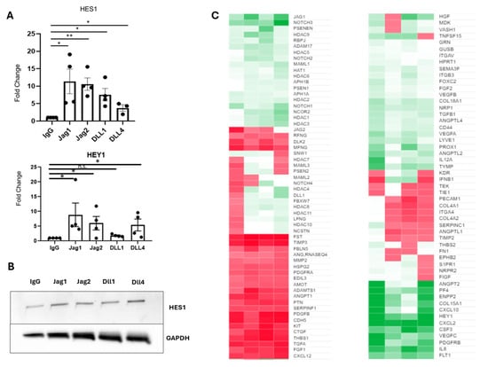 The four canonical Notch ligands drive substantially different gene expression profiles in c-kit+ hCPCs. (A) HES1 expression is upregulated in all four treatment groups, though Jag1 and Jag2 drive the strongest response. HEY1 expression is upregulated by Jag1, Jag2, and Dll4, but not Dll1. N = 4 per group, (**) p < 0.005, (*) p < 0.05, (n.s.) not significant, one-way ANOVA. (B) HES1 protein level increases upon activation of Notch by Jag1/Jag2/Dll1/Dll4. (C) Heat map demonstrating gene expression in response to all 4 ligands. Gene expression was normalized to IgG control beads and presented as fold change over control.