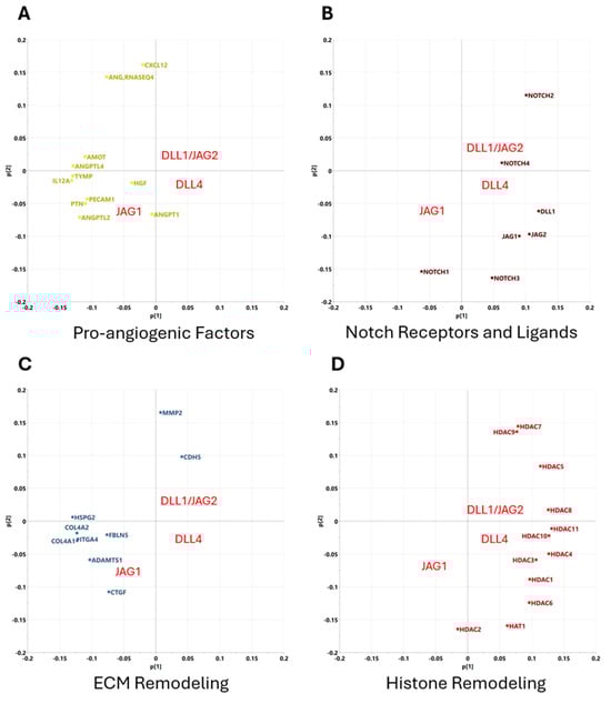 PCA reveals clusters of genes that co-vary closely with particular Notch-activating ligands. (A) Genes associated with pro-angiogenic factors co-vary with Jag1 stimulation. (B) Genes associated with ECM remodeling co-vary with Jag1 stimulation. (C) Genes associated with Notch receptors and ligands co-vary with Jag2/Dll1/Dll4 stimulation. (D) Genes associated with Hitone remodeling co-vary with Jag2/Dll1/Dll4 stimulation.