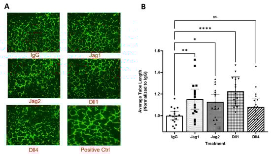 Endothelial cell tube formation is enhanced across all treatment groups compared to IgG, but differences between the four canonical ligands are not significant. (A) Representative fluorescent images of endothelial cell tubes after 6 h. (B) Quantified average tube length. N = 16 for each treatment group. (*) p < 0.05, (**) p < 0.005, (****) p < 0.00005, (ns) Not significant, one-way ANOVA.