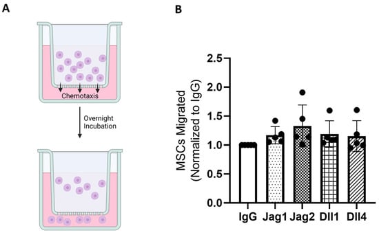 We also considered the secretion of pro-migratory factors that may attract other beneficial cell types, such as MSCs. The inflammatory chemokines CXCL10 and CXCL2 are both known to play a role in attracting mesenchymal stem cells, and both were strongly upregulated upon treatment with Jag1 as opposed to the other canonical ligands []. CXCL10 showed 12-fold greater expression while CXCL2 showed 8-fold greater expression in response to Jag1 stimulation, although these chemokines were also upregulated to a lesser degree in the other treatment groups. Based on this, we hypothesized that a transwell migration assay for bone marrow-derived hMSCs would demonstrate greater migration in response to the Jag1-treated conditioned media. However, although migration of MSCs was greater across all groups compared to our control, there were no significant differences between Jag1 and the other treatment groups. It is possible that other important cell types are more strongly attracted, and future studies will focus on determining if this is the case.