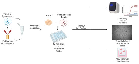 The design of this study is illustrated in Figure 6. Briefly, protein G Dynabeads (Thermo-Fisher Scientific, Waltham, MA, USA) were incubated overnight with Fc-conjugated Notch ligands. CPCs were then incubated with functionalized beads in a 12 well plate for a period of 48 h. At the conclusion of this period, conditioned media and RNA were harvested for the remaining experiments.