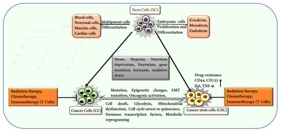 - Walcher, L.; Kistenmacher, A.-K.; Suo, H.; Kitte, R.; Dluczek, S.; Strauß, A.; Blaudszun, A.-R.; Yevsa, T.; Fricke, S.; Kossatz-Boehlert, U. Cancer stem cells—Origins and biomarkers: Perspectives for targeted personalized therapies. Front. Immunol. 2020, 11, 1280. [Google Scholar] [CrossRef]