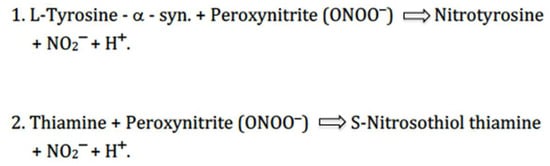 - Schildknecht, S.; Gerding, H.R.; Karreman, C.; Drescher, M.; Lashvel, H.A.; Outeiro, T.F.; Di Monte, D.A.; Leist, M. Oxidative and nitrative alpha-synuclein modifications and proteostatic stress: Implications for disease mechanisms and interventions in synucleinopathies. J. Neurochem. 2013, 125, 491–511. [Google Scholar] [CrossRef]