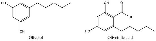 - Lee, Y.-E.; Kodama, T.; Morita, H. Novel insights into the antibacterial activities of cannabinoid biosynthetic intermediate, olivetolic acid, and its alkyl-chain derivatives. J. Nat. Med. 2023, 77, 298–305. [Google Scholar] [CrossRef]