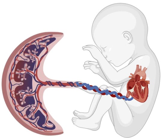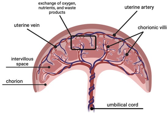 The placenta, placental membrane, umbilical cord, and amniotic fluid are all considered placental tissues [9]. Human placental tissues are derived from both maternal and fetal cells to produce distinct uteroplacental and fetoplacental circulatory systems [9,10,11]. The placental membrane consists of three layers: the amnion, the chorion, and an intermediary collagen and proteoglycan network [9]. The amnion layer is fetal facing and acts to protect and enclose the growing fetus in amniotic fluid [9,10]. The chorion, which includes the syncytiotrophoblast and cytotrophoblast, is maternal facing [7,9]. The chorionic villi, which protrude into the intervillous space and enable oxygen and nutrient transfer across the placental membrane, are created when the cytotrophoblast encroaches into the syncytiotrophoblast (Figure 3). Further growth of the villi allows for the emergence of blood vessels and capillary beds. A key structure that these capillaries connect to is the embryo’s heart, the first organ to develop during organogenesis [7,12]. This network provides the basis for fetal circulation from the two umbilical arteries to the placenta, then returns with increased oxygen via the umbilical vein. The placenta is the largest organ for a growing fetus and receives almost half of fetal cardiac output [13]. While the amniotic and chorionic layers are histologically separate, the fetal and maternal vessels are still able to exchange nutrients, gases, and waste products in the placenta through passive and active transport [7,9,10]. Thus, all these tissues are essential to placental function.