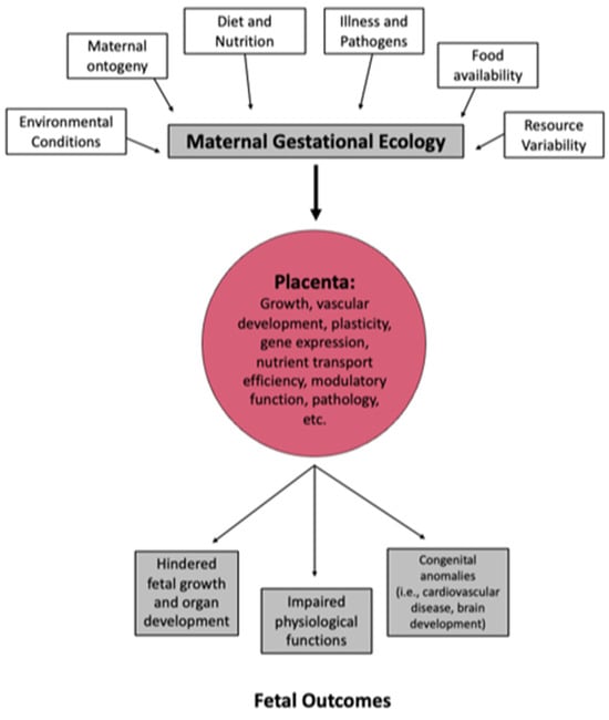 Multiple components of maternal ecology can contribute to changes in placental function, which in term mediate fetal outcomes.