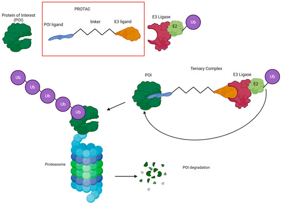 PROTAC is a molecule composed of a ligand, usually a small-molecule inhibitor for the POI, and a covalently linked ligand of an E3 ubiquitin ligase (E3). Moreover, the composition of the linker can be used to modify the properties of the PROTAC, such as membrane permeability, aqueous solubility, metabolic stability, and biodistribution. This can help in the development of suitable therapeutic agents and tools. These heterobifunctional molecules simultaneously involve a POI and an E3 ligase, forming a ternary complex. This complex results in the proximity-induced ubiquitination of the POI by the E3 ligase, which subsequently induces proteasome-mediated degradation of the POI itself (Figure 1). The 26S proteasome is responsible for this process, as previously described.