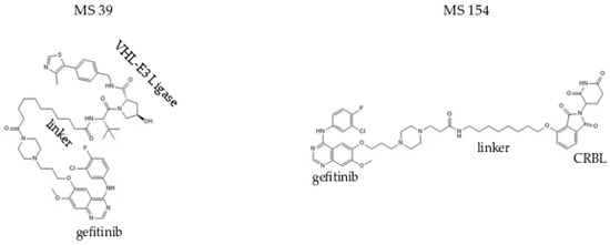 Chemical Structures of MS39 and MS154. MS39 is a selective and effective VHL-recruiting degrader of the mutated EGFR, while MS154 is a CRBN—recruiting degrader of the mutated EGFR [41].