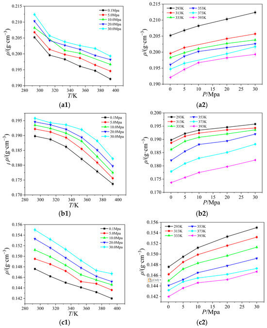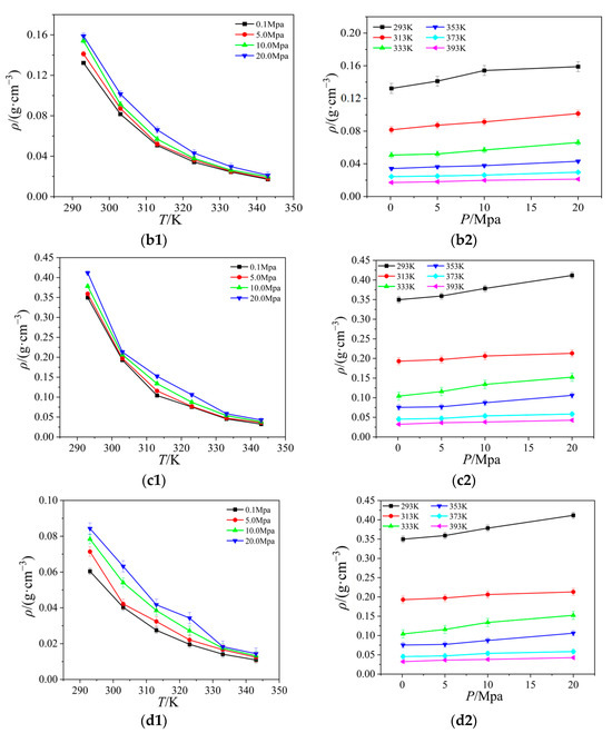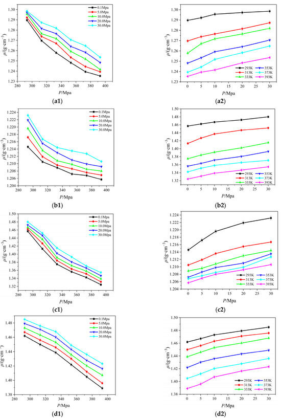 Relationship between four ionic liquid densities for temperature and pressure: (a) [Emim][BF4]; (b) [Bmim][BF4]; (c) [Bmim][PF6]; (d) [Bmim][Tf2N].