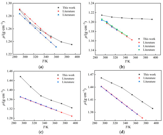 A comparison between computed results and data from the literature of four ionic liquids’ density: (a) [Emim][BF4]; (b) [Bmim][BF4]; (c) [Bmim][PF6]; (d) [Bmim][Tf2N].