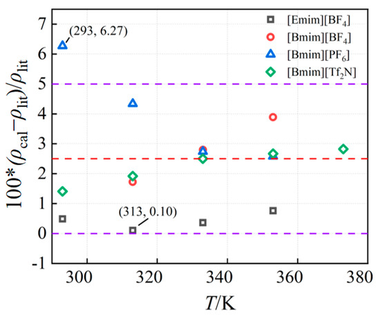 In this work, the density simulation data of four ionic liquids were compared with the values in the literature [15,16,17,18,19,20,21,22,23], as shown in Figure 2 and Figure 3. Values in the literature were determined by experimental methods, and their values are in general agreement with the trend. The simulated and experimental values are in good agreement, and the relative deviation is mostly within the range of 0~5% at atmospheric pressure, which meets the needs of engineering. The maximum deviation of all comparisons is 6.27% ([Bmim][PF6] at 293 K), while the minimum deviation is 0.1% ([Emim][BF4] in 313 K).