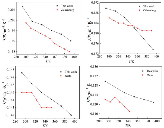 Thermal conductivity is an important thermophysical parameter, reflecting the thermal performance of the material, and is used to identify the material insulation performance as one of the main signs of good engineering design, and has an important role. In this section, the thermal conductivity values of these four ionic liquids at different pressures and temperatures are calculated with the NEMD method, and the results are shown in Figure 5. At the same time, the simulated values of the thermal conductivity of four ionic liquids at atmospheric pressure are compared with the experimental values in the literature [19,20,21], as shown in Figure 6.