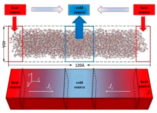 Similar to the density and viscosity calculation system, in the thermal conductivity simulation system, the first layer is set as the heat source, the 11th layer as the cold source, the middle section is the heat transfer region, and the two regions mirror each other. The heat flux of 0.012 kcal/mol was chosen to calculate the thermal conductivity. In the process of simulation, energy is extracted from the cold source while the heat is injected into the heat source to form a temperature gradient. At the beginning of the simulation, the energy of the whole system is minimized to keep the system relaxation balance and avoid the collapse of the simulation system due to atomic overlap and collision. When the system is stable, the temperature and pressure of the NPT ensemble control system remain unchanged for 1 ns. Then, the NPT ensemble is removed, the NVE ensemble is applied to the system, a certain amount of heat flow is added in layer 1, and the same amount of heat flow is extracted from layer 11 to keep the energy of the whole system constant; thus, a temperature field is constructed in the simulation system, and a temperature gradient is formed in the system with a duration of 2 ns. In this process, the thermal and temperature gradients of the system are obtained by analyzing the atomic trajectories, and the thermal conductivity is obtained using Fourier’s law [29]: