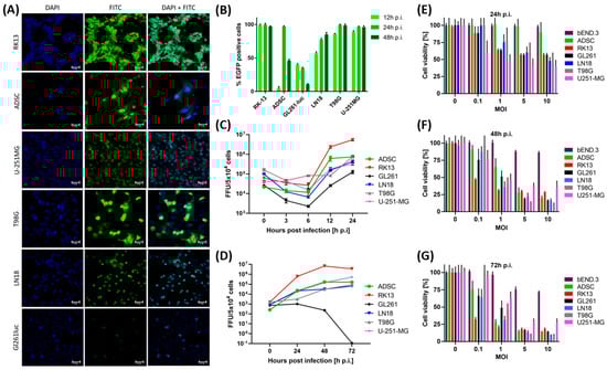 Figure 1. Permissiveness and cell viability. Cell lines: RK-13 and ADSCs as well as GL261, T98G, LN18, and U-251MG (gliomas) infected with vMyx-M011L-KO/EGFP; (A) Representative images of infected cells (MOI = 5) after 24 h p.i. stained and visualized by fluorescence microscopy (Zeiss LSM 710 confocal workstation; magn. 20×; scale bar = 50 µm); blue: DAPI dye (nuclei); green: EGFP fluorescence; (B) Flow cytometric quantitation (12–48 h p.i.) of infected EGFP-positive cells in tested cell lines (MOI = 5); Replication of the virus in tested cell lines by determining (C) the single- (MOI = 5) and (D) multi-step virus growth curve (MOI = 0.02). Cell viability assay (MTS) for bEnd.3, RK-13, ADSCs and glioblastoma GL261, T98G, LN18 and U-251MG lines and four different MOI values: (E) 24 h, (F) 48 h and (G) 72 h time points p.i. and eight independently infected wells were examined. Error bars represent SD of the measurements.