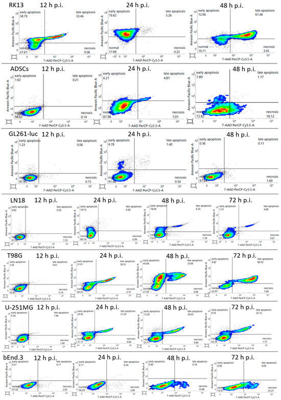 Figure 2. Analysis of Apoptosis by Flow Cytometry. Cells were seeded at a density of 1 × 105 cells/well using 6-well plates and vMyx-M011L-KO/EGFP (MOI = 5) was added to the cultured cells. After 12, 24 h and 48 h (RK-13, ADSCs, and GL261-luc) and after 12, 24, 48 and 72 h p.i. (LN18, T98G, U-251 MG and bEnd.3) cells were collected and washed twice with PBS and staining buffer. Cells were then stained with Annexin V-Pacific Blue™ and 7-AAD and analyzed for apoptosis/necrosis using flow cytometry (BD FACSLyric™). Annexin V was detected using the Pacific Blue channel and 7-AAD using the PerCP-Cy5.5 channel and a region for live cells was defined. Non-infected cells were used as a control. Q1—early apoptotic cells; Q2—viable cells; Q3—late apoptotic cells; and Q4—necrotic cells.