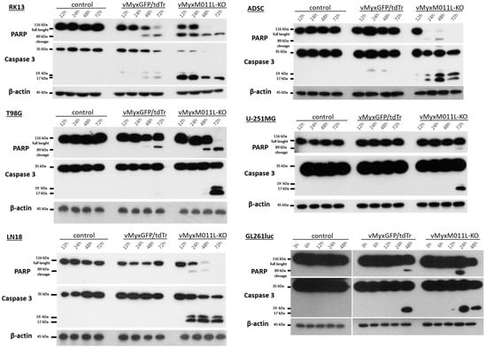 Figure 3. Expression of apoptotic proteins by Western blot analysis of lysates obtained from cell cultures infected (MOI = 5) with vMyx-EGFP/tdTr or vMyx-M011L-KO/EGFP constructs. Lysates were prepared from whole cell extracts after 12, 24, 48 and 72 h p.i. (RK-13, ADSCs, T98G, U-251 MG and LN18) and after 3, 6, 12, 24, and 48 h p.i. (GL261luc; control samples run on separate gel, same experiment). Full-length (116 kDa) and cleaved forms (89 kDa) of poly ADP-ribose polymerase (PARP), as well as endogenous levels of the full length caspase-3 (35 kDa) and the large fragment of caspase-3 resulting from cleavage (19/17 kDa) were assessed by immunoblotting using β-actin as a loading control. See also Figure S1.