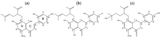 Chemical structures of S. flavescens: (a) kuraridin, (b) kushenol A, and (c) kurarinol.