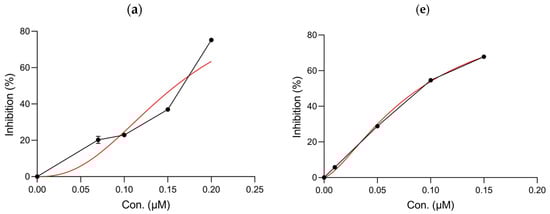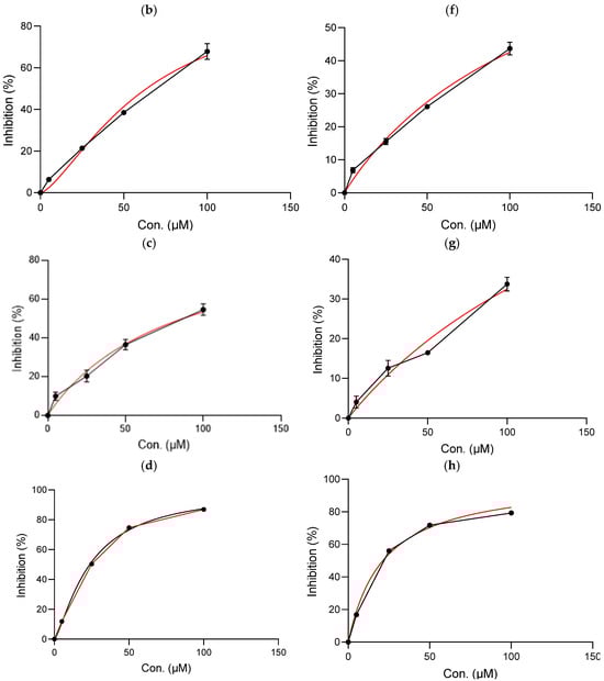 Inhibitory properties of kuraridin, kushenol A, and kurarinol on tyrosinase activity. The anti-tyrosinase activities using L-tyrosine were (a) kuraridin, (b) kushenol A, (c) kurarinol, and (d) kojic acid, and the anti-tyrosinase activities using L-DOPA were (e) kuraridin, (f) kushenol A, (g) kurarinol, and (h) kojic acid. Black and red lines represent IC50 values and the trend values, respectively.