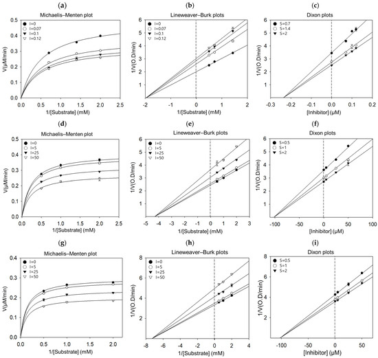 The kinetic characteristic of the oxidation of L-tyrosine catalyzed by tyrosinase in the presence of three compounds with potent inhibitory activity (IC50 < 100 μM) was investigated. As shown in Figure 3a–i and Table 1, all compounds were non-competitive inhibitors of monophenolase activity, indicating that they bind to the allosteric site rather than the substrate-binding site in tyrosinase, leading to a reduction in enzyme activity while maintaining the substrate affinity of the enzyme. Furthermore, the Ki values of kuraridin, kushenol A, and kurarinol were 0.24, 102.3, and 100.6 μM, respectively, indicating that kuraridin had the highest binding affinity with tyrosinase, which is consistent with its inhibitory property.