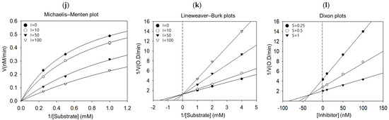 The kinetics of kuraridin, kushenol A, and kurarinol against tyrosinase activity using L−tyrosine and L−DOPA. Michaelis−–Menten plots for anti-tyrosinase activity by (a) kuraridin, (d) kushenol A, and (g) kurarinol in the presence of L−tyrosine. Lineweaver–Burk plots for anti-tyrosinase activity by (b) kuraridin, (e) kushenol A, and (h) kurarinol in the presence of L-tyrosine. Dixon plots for anti-tyrosinase activity by (c) kuraridin, (f) kushenol A, and (i) kurarinol in the presence of L−tyrosine. (j) Michaelis–Menten plot, (k) Lineweaver–Burk plot, and (l) Dixon plot for anti-tyrosinase activity by kuraridin in the presence of L-DOPA.
