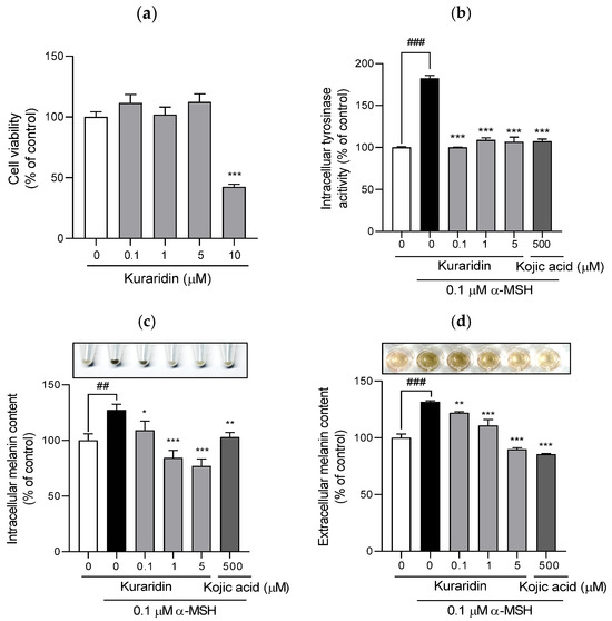 Effect of kuraridin on the viability, tyrosinase activity, and intracellular and extracellular melanin contents of B16F10 cells. (a) Cell viability was determined by the CCK assay. Cultured B16F10 cells were pretreated with kuraridin (0.1, 1, and 5 μM) for 72 h. (b) Cells were collected and centrifuged to obtain pellets. The pellets were dissolved in 1 N NaOH, and the relative amount of melanin was determined by measuring the absorbance at 405 nm. (c,d) After treatment under the same conditions used for the determination of melanin synthesis, cells were collected and lysed. Tyrosinase activity was measured using L-DOPA as a substrate. Cell viability, melanin contents, and tyrosinase activity in control cells were considered 100%. Values are expressed as the mean ± SD in at least three independent experiments. ### p < 0.001 and ## p < 0.01, as compared with the control group; *** p < 0.001, ** p < 0.01 and * p < 0.05 as compared with α-MSH only.