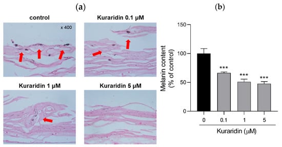 As shown in Figure 5a, melanin contents in the epidermis were significantly reduced after treatment with kuraridin at all concentrations (p < 0.001), as shown by Fontana–Masson-stained tissue sections. Interestingly, kuraridin at 0.1, 1, and 5 μM doses significantly reduced melanin content by 66.41 ± 1.54%, 54.07 ± 4.7%, and 47.87 ± 3.6%, respectively (Figure 5b).