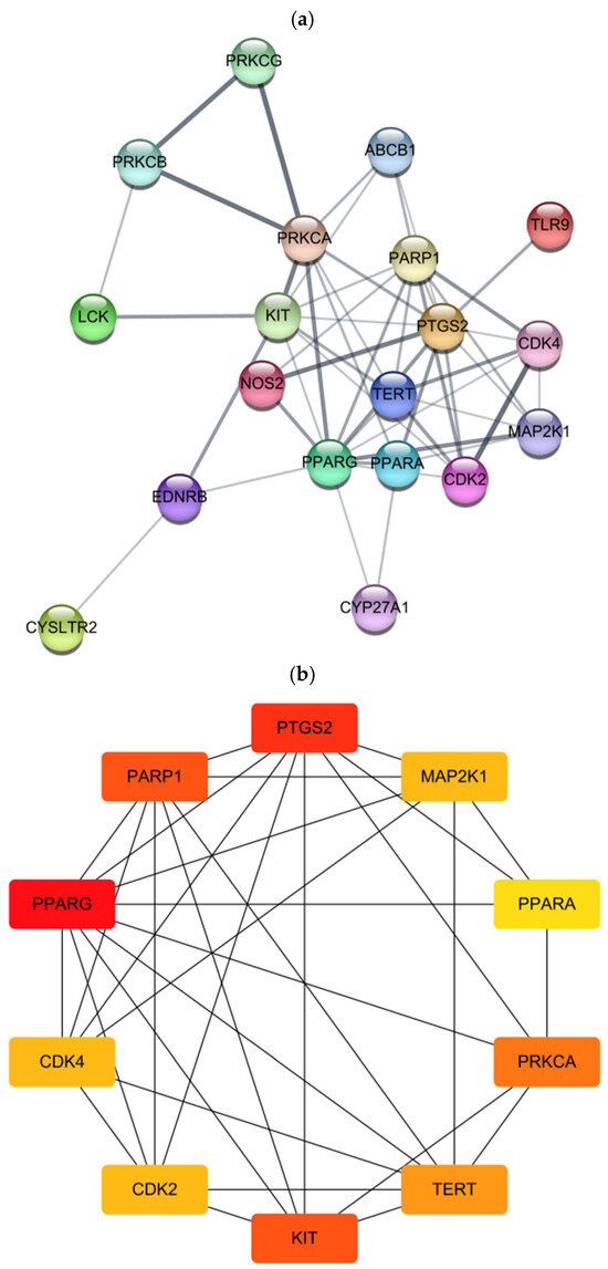 In the first step of the network pharmacology analysis, 513 targets for melanogenesis and 102 targets for kuraridin were identified using GeneCards and SwissTargetPrediction, respectively. Protein–protein interactions (PPI) for 19 overlapping genes between melanogenesis and kuraridin were constructed in the second step, resulting in 19 nodes (circles) and 50 edges (connecting lines; Figure 6a). Third, among the nodes of kuraridin, the top 10 targets with a high degree of connectivity were selected as hub genes as follows: PPARG, PTGS2, KIT, PARP1, PRKCA, TERT, CDK2, CDK4, MAP2K1, and PPARA (Table 3 and Figure 6b).