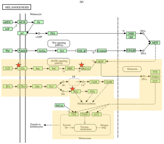 Kyoto Encyclopedia of Genes and Genomes (KEGG) enrichment analysis was performed to elucidate the signaling pathways of proteins encoded by target genes. The results showed that kuraridin was most strongly associated with the melanogenesis pathway but not with the cancer pathway (Figure 6d). Moreover, three hub genes, KIT, protein kinase C alpha (PRKCA), and mitogen-activated protein kinase 1 (MAP2K1), were found to be closely related to the melanogenesis pathway, suggesting that these results further narrowed the scope of research on the anti-melanogenic mechanism of kuraridin. Figure 6e represents the predicted anti-melanogenesis-related target genes and kuraridin-signaling pathways. Kuraridin was shown to regulate two melanogenic signaling pathways such as tyrosine-protein kinase Kit receptor (c-KIT) and endothelin receptor type B (ETB-R), among four different melanogenic signaling pathways.