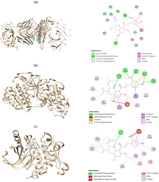A molecular docking study was performed to verify the interaction between kuraridin and melanogenesis target genes screened by network pharmacology and to explore the molecular mechanism of the compound in hyperpigmentation. As shown in Figure 7, all four complexes between kuraridin and tyrosinase, c-KIT, ERK1/2, and PKC exerted strong interactions with the lowest binding energies of −8.4, −9.2, −9.2, and −7.5 kcal/mol, respectively. In general, the lower the binding energy, the more likely the ligand is to interact with the protein, and the ligands with a binding energy of less than −7.0 kcal/mol are considered to have high binding affinity for the target protein. [19]. In addition, various types of non-covalent interactions, such as hydrogen bonding and pi interactions, are present, resulting in the formation of tight and stable protein–ligand complexes after docking.