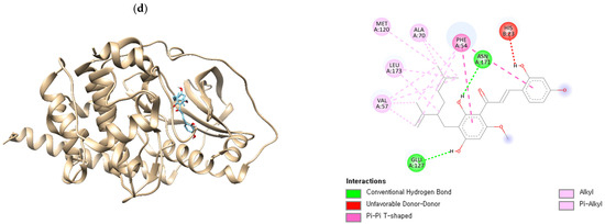Molecular docking analysis of (a) kuraridin–tyrosinase, (b) kuraridin–c-KIT, (c) kuraridin–ERK1/2, and (d) kuraridin–PKC.