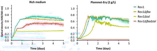 Growth studies of the mutant strains in rich medium showed no effect of single fba mutation on the growth of Rev1, consistent with previous findings in B. suis 513 [], and an impaired bacterial growth in the case of Rev1Δtal and Rev1ΔfbaΔtal (Figure 2). Intriguingly, the tal single mutant exhibited shorter generation times and lower growth yields than the double mutant Rev1ΔfbaΔtal. While the tal mutant phenotype is likely due to Rev1’s reliance on the Pentose Phosphate pathway as the only route for hexose metabolism [], the reduced doubling time of the fba-tal mutant compared to Rev1Δtal may be due to metabolic rearrangements caused by the absence of two key enzymes in the central carbon metabolism. In the case of growth on erythritol as a carbon source, only the double mutation on fba and tal completely ablated the growth of Rev1 (Figure 2), with the Rev1Δtal growth curves showing a longer lag phase not detected for the Rev1Δfba mutant, a phenomenon also observed for B. suis 513 []. These findings confirm the indispensability of both fba and tal for the growth of Rev1 on erythritol and support the existence of the newly described erythritol Fba-bypass [] in other Brucella species, although further studies on other model Brucella spp. are required to reach more robust conclusions on the genus.