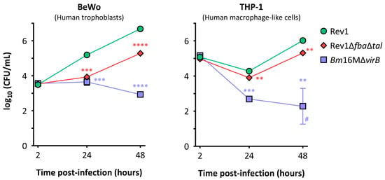 2.2. Rev1ΔfbaΔtal Is Attenuated in Trophoblastic and Macrophagic Cellular Models