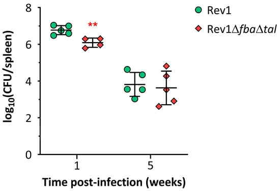 Rev1∆fba∆tal multiplication in the spleen of BALB/c mice. Mice (n = 5) were IP-infected with 105 CFU/mouse of Rev1 or Rev1∆fba∆tal and euthanized at one and five weeks p.i. Bacterial burden at the spleens was determined by CFU counting and is expressed as mean log10(CFU/spleen) ± SD. Statistical comparisons at each time-point were made by unpaired t-test (** p < 0.01). The experiment was performed twice, obtaining similar results.
