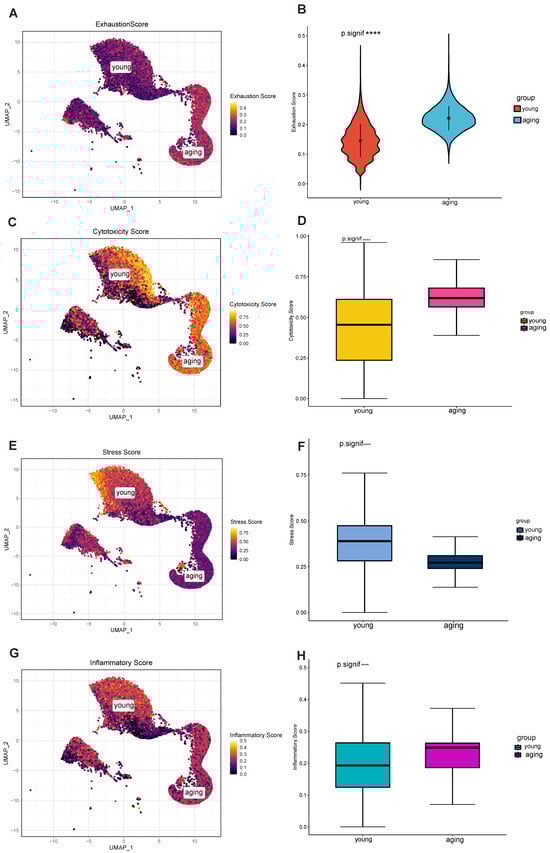 In terms of cytotoxicity, the cytotoxicity score of the aging group was significantly higher than that of the young group (Figure 2C), and this difference was statistically significant (Figure 2D). Some forms of cytotoxicity may accelerate cellular senescence or lead to cellular exhaustion, while cellular senescence and exhaustion may also increase sensitivity to toxic factors []. Significantly, in terms of stressful pressures, the younger group exhibited higher stress scores (Figure 2E,F). This suggests that the younger group was more adaptive and resilient in response to stress and challenges compared to the senescent group, prompting the cells to undergo the aging process faster. As for the degree of inflammation, the senescent T-cell subpopulation showed relatively high inflammation scores (Figure 2G,H) and predominantly expressed CCL3, CCL4, and CCL4L2, suggesting its ability to recruit other immune cells such as T cells []. Inflammatory cytokines enhance immunity by guiding naïve CD8+ T cells to sites of interaction with CD4+ T cells and dendritic cells. Yet, the frequency of both antigen-bearing cells and relevant naïve T cells is low during early infection. This suggests that active mechanisms promote the necessary cellular interactions.