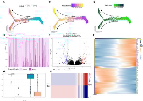 Next, we used Monocle to analyze the pseudotime trajectories of T cell subpopulations. Based on the senescence genes given by the official website of Human Aging Genomic Resources (https://genomics.senescence.info/, accessed on 14 April 2023), we distinguished the aging and young T cell differentiation trajectories (Figure 3A), with young T cell populations at the beginning and aging T cell populations at the end, which is a significant effect of subpopulation. And the results of ssGSEA senescence scoring of individual samples were validated on the proposed time-series axis (Figure 3C), and the computational results were consistent with the monocle algorithm (Figure 3B). The FindAllMarkers function was used to calculate the feature genes in different trajectories, in which the TOP50 feature genes were expressed as shown (Figure 3F), such as the LTB gene (lymphotoxin β) which is a potential biomarker for lymphocyte differentiation []. Ultimately, we identified signature genes in the T-cell exhaustion trajectory in hepatocellular carcinoma, which we defined as the T-cell exhaustion-related genes (TERGs).
